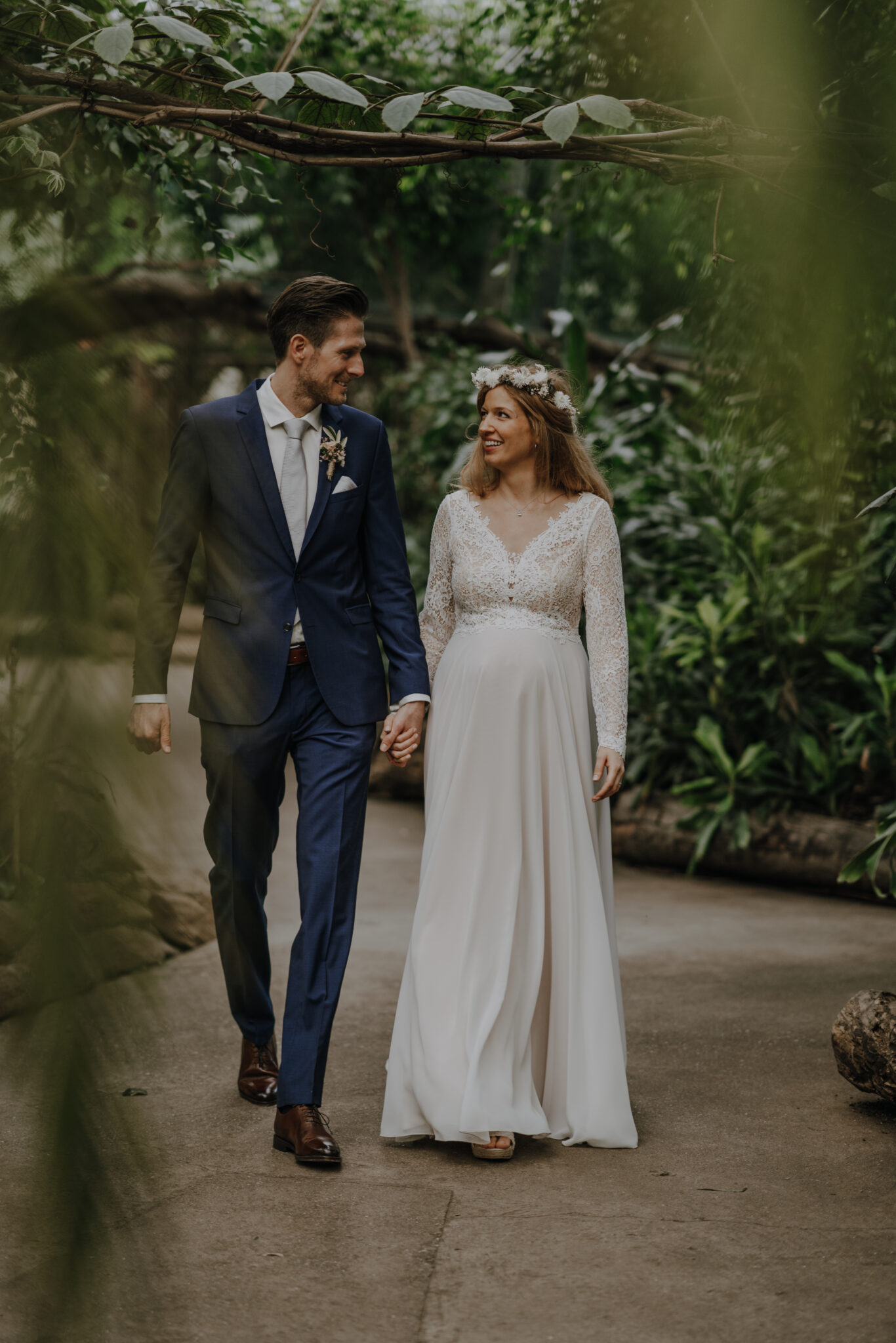 Durch ein Spalier aus roten Rosen ging es für Nora & Benedikt nach der Zeremonie und einem umarmungsreichen Sektempfang, zum Paarshooting im Affenhaus des Zoos. Ebenso wie das Tropenhaus bietet dieses eine wunderschöne Shooting-Location mit Palmen, engen Pfaden und kleinen Wasserfällen. Während sich die Hochzeitsgesellschaft dick eingepackt die restlichen tierischen Bewohner des Zoos anschaute, konnte sich das Brautpaar bei kuscheligen Temperaturen aufwärmen. So gelang es mir wunderschöne, entspannte Aufnahmen der beiden zu machen, trotz der frühen Jahreszeit.
